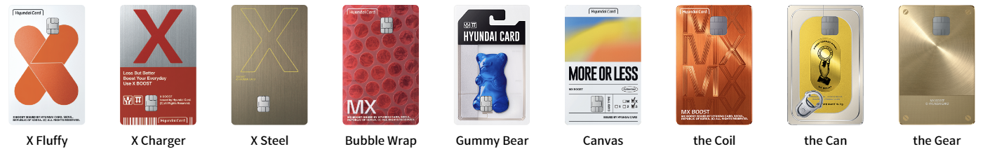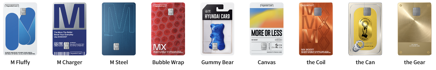 더블랙에디션3 - 더퍼플오제 - 더레드스트라이프 - 더레드에디션5 - 더그린에디션2 - 더핑크 - M에디션3 - M2에디션3 - M3에디션3 - M부스트 - M2부스트 - M3부스트 - X에디션3 - X2에디션3 - X3에디션3 - X부스트 - X2부스트 - X3부스트 - MX - Z패밀리 - Z워크 - Z온택트 - 제로에디션2(할인형) - 제로에디션2(포인트형) - 제로모바일에디션(할인형) - 제로모바일에디션(포인트형) - 현대모빌리티플래티넘 - 현대모빌리티 - 현대모빌리티(상용차) - 현대모빌리티(상용차화물차유가보조금) - 현대모빌리티(캐스퍼경차) - 현대EV - 제네시스 - 기아멤버스에디션2 - 기아멤버스전기차 - 기아멤버스경차(유류세환급) - 대한항공더퍼스트 - 대한항공150 - 대한항공070 - 대한항공030 - 아멕스플래티넘 - 아멕스골드/로즈골드 - 아멕스그린 - NOL - 무신사 - 이마트e카드 - 스마일카드더클럽 - 스마일카드에디션2 - 코스트코리워드 - SSG.COM - 네이버 - 배민 - 스타벅스 - 에너지플러스에디션2 - 넥슨언리미티드 - 넥슨 - 넥슨체크